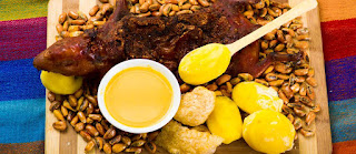 This dish is typically served in cuyerías with corn on the cob, rice, potatoes, sweet potatoes, salsas, and salads.